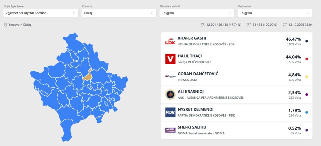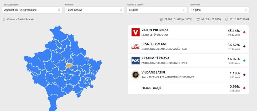 Politikë Obiliqi , Fushkosova, Vushtrria në balotazh nga World Ks 12 Tetor, 2025 shkruar nga World Ks 12 Tetor, 2025 30 0 komentet 1 FacebookTwitterPinterestEmail World Ks postimi i mëparshëm Rezultati i zgjedhjeve për Podujevën për momentin postimi i radhës Drenasi Ramiz LLadrovci fiton pa balotazh Ju gjithashtu mund të pëlqeni Kur kryetari bie në gropën që e hapi... 13 Tetor, 2025 Halil Thaqi i falenderon votuesit në Komunen e... 13 Tetor, 2025 Kamenica VV fiton pa Balotazh 13 Tetor, 2025 Prishtina shkon në Balotazh VV-LDK 13 Tetor, 2025 Fushë Kosova shkon në Balotazh VV-LDK 13 Tetor, 2025 Mitrovica shkon në Balotazh VV-PDK 13 Tetor, 2025 Obiliqi shkon në Balotazh VV-LDK 13 Tetor, 2025 Podujeva VV fiton pa Balotazh 13 Tetor, 2025 Drenasi Ramiz LLadrovci fiton pa balotazh 13 Tetor, 2025 Rezultati i zgjedhjeve për Podujevën për momentin 12 Tetor, 2025 Lini një koment Anulo përgjigjen Save my name, email, and website in this browser for the next time I comment.